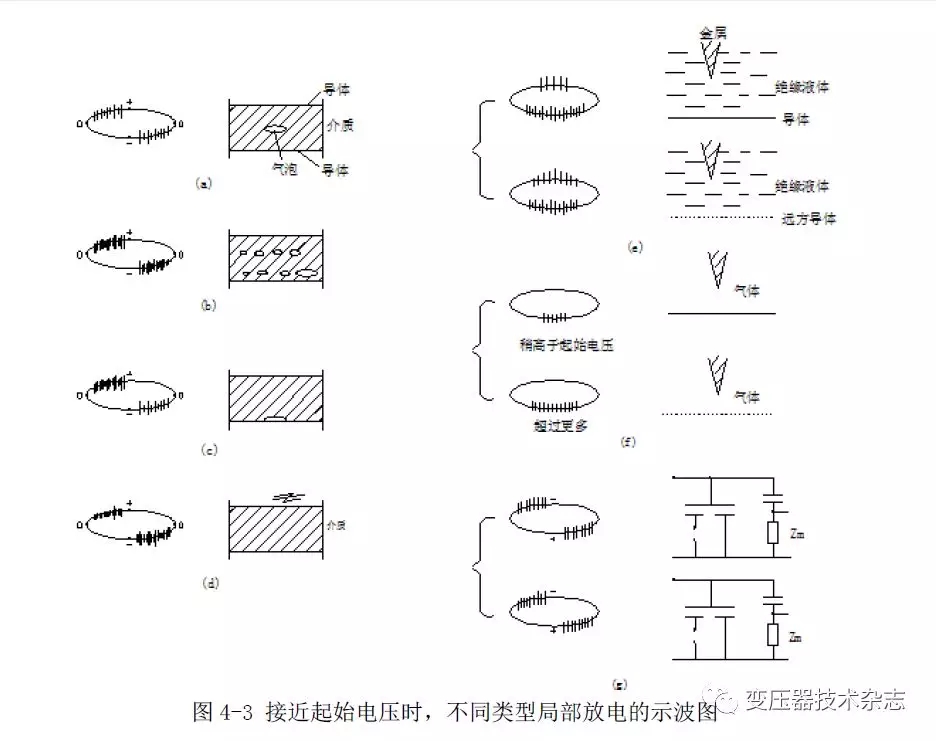 (d)中,(1 )一簇不同尺寸的气隙位于电极的表面,但属封闭型;(2 )电极与绝缘介质的表面放电气隙不是封闭的。放电脉冲叠加于电压的止及负峰值之前两边幅值比通常为3:1,有时达10:1。随电压上升,部份脉冲向零位方 向移动.放电起始后,脉冲分辨率尚可;继续升压,分辨率下降直至不能分辨。放电起始后放电皇随电压的上升逐渐增大,熄灭电压等于或略低于起始电压。如电压 持续时间在10 min以后,放电响应会有些变化。