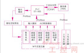 为能对变压器的温度进行实时监测和控制,要求设计的系统能对多台变压器的绕组和铁心温度进行测量,实时在hmi上显示,并能对数据进行分析,一旦温度超出设定最高温度时进行声光报警,达到极限设定温度时自动切除负荷进行保护。当温度达到强制散热设定值时,启动风扇进行强制散热。服务器能对变压器的温度进行记录,并能生成曲线图,随时能为技术人员提供查询。