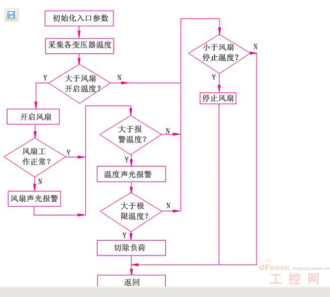 人机界面用来显示每台变压器的温度,并可以方便的设置系统的参数,如报警温度值,切除负荷温度值,启/停风扇温度值等参数。可以实时查看每台变压器的绕组和铁心的温度,并可以显示变压器负荷和温度关系曲线。必要时还可通过hmi上的按钮,手动启/停风机,消除报警及切除负荷等操作。在服务器上,记录着各种报警信息及故障发生时的各相温度值、时间等信息,可按时间条件进行查询,并根据需要进行打印和负荷图表输出。该系统中的数据采集处理、风机运行和故障报警由plc和hmi通过编制的相应程序来完成。