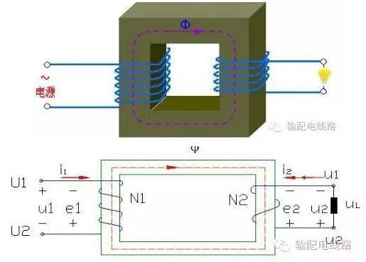 铁心的作用是加强两个线圈间的磁耦合。为了减少铁内涡流和磁滞损耗,铁心由涂漆的硅钢片叠压而成;两个线圈之间没有电的联系,线圈由绝缘铜线(或铝线)绕成。一个线圈接交流电源称为初级线圈(或原线圈),另一个线圈接用电器称为次级线圈(或副线圈)。实际的变压器是很复杂的,不可避免地存在铜损(线圈电阻发热)、铁损(铁心发热)和漏磁(经空气闭合的磁感应线)等,为了简化讨论这里只介绍理想变压器。理想变压器成立的条件是:忽略漏磁通,忽略原、副线圈的电阻,忽略铁心的损耗,忽略空载电流(副线圈开路原线圈线圈中的电流)。例如电力变压器在满载运行时(副线圈输出额定功率)即接近理想变压器情况。