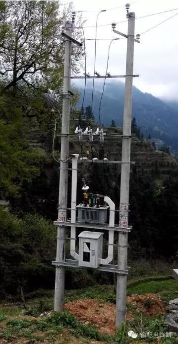 变压器、高压跌落式熔断器和高压避雷器装在同一根电杆上。结构简单,安装方便,用料少,占地少,适用于安装50KVA以下的配电变压器.