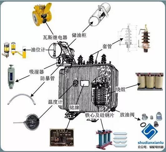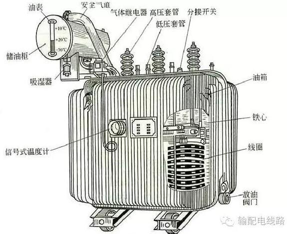 本次小编以油浸式配电变压器进行结构介绍,油浸式配电变压器按其结构可分为本体、储油柜、绝缘套管、分接开关、保护装置等。如下图