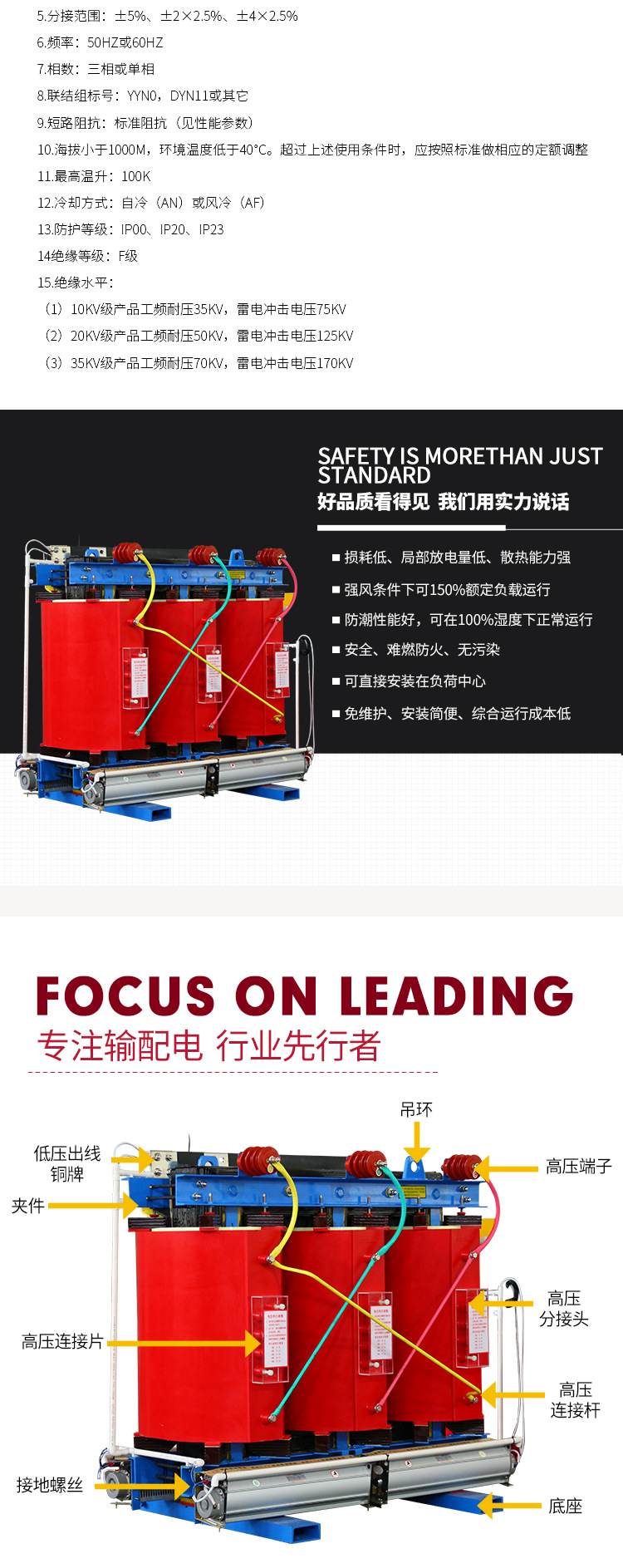 突出优势:损耗低、节能、运行经济、免维护、工艺结构先进、抗短路、雷电冲击水平高外,还具有阻然、防潮、防尘、噪声低等特点
