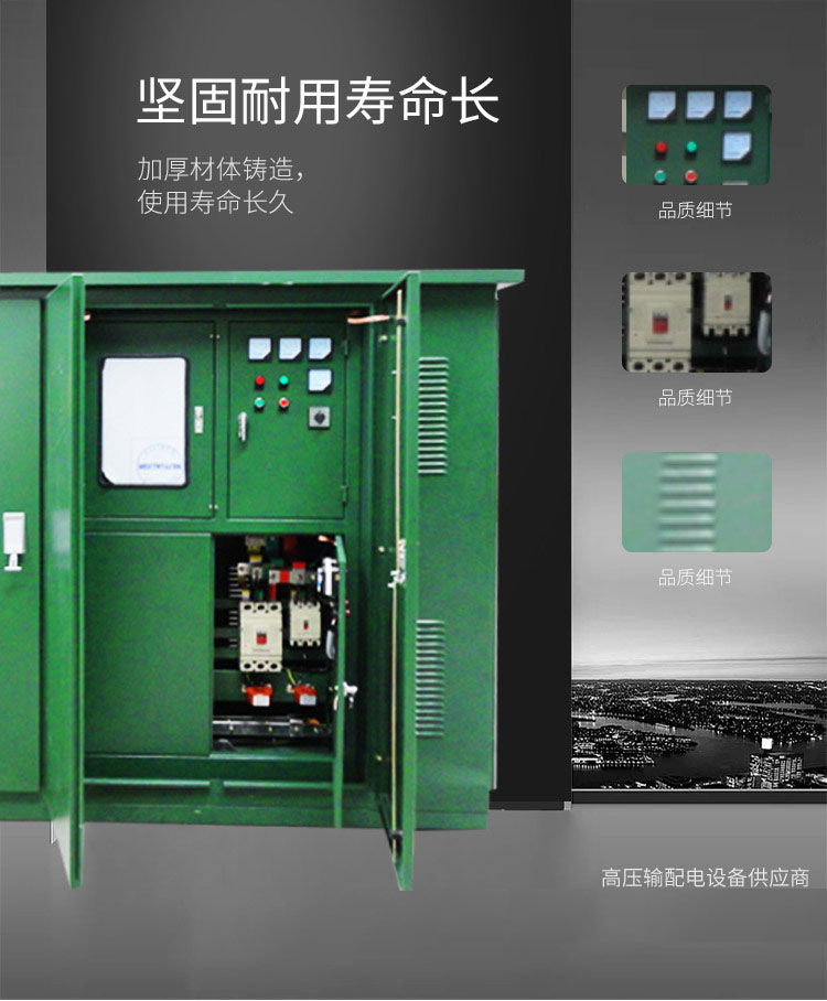 突出优势:损耗低、节能、运行经济、免维护、工艺结构先进、抗短路、雷电冲击水平高外,还具有阻然、防潮、防尘、噪声低等特点